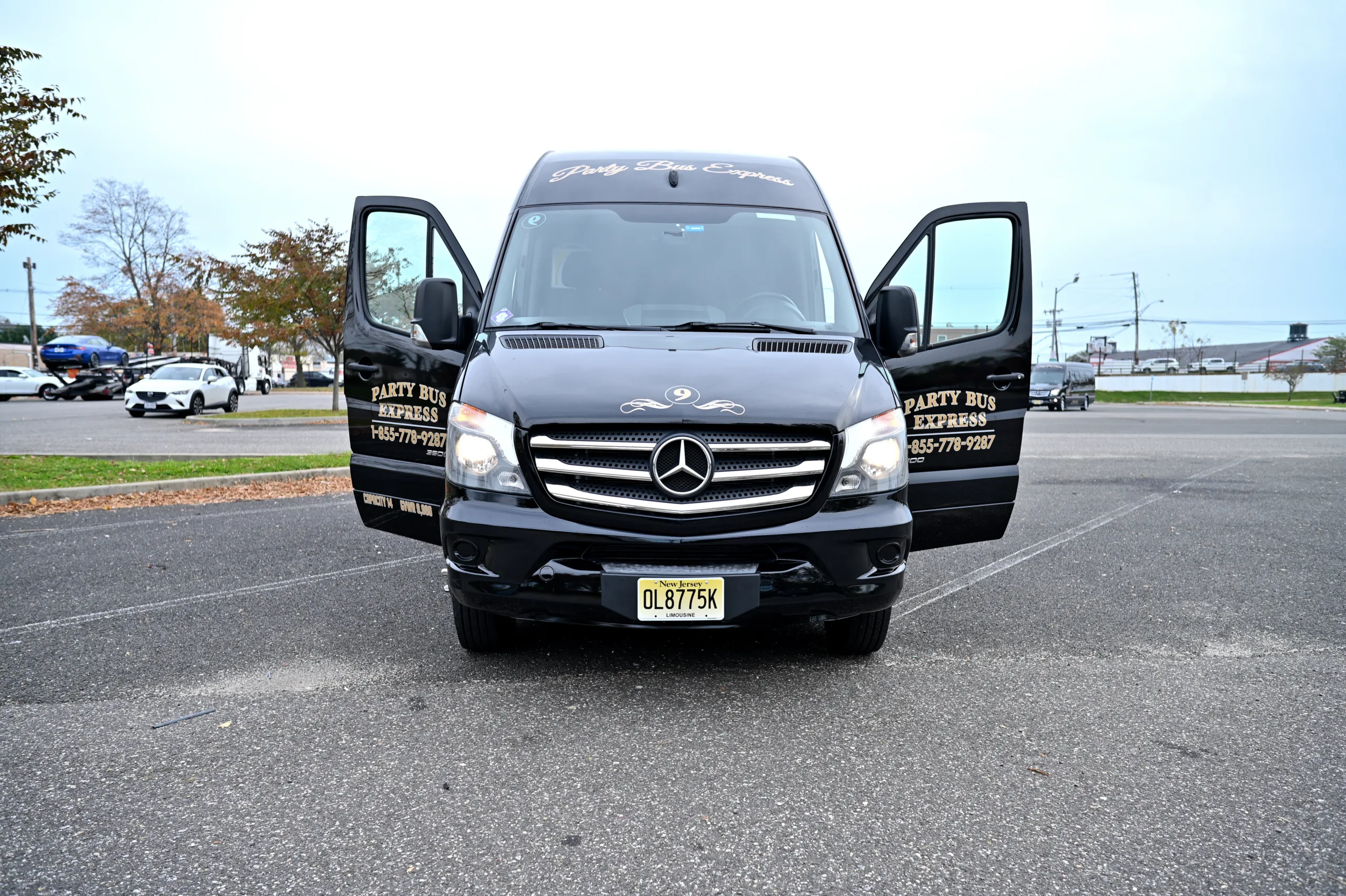 Premium 15-passenger sprinter van with plush captain’s chairs, diamond-stitched leather, and hardwood flooring for sophisticated groups.