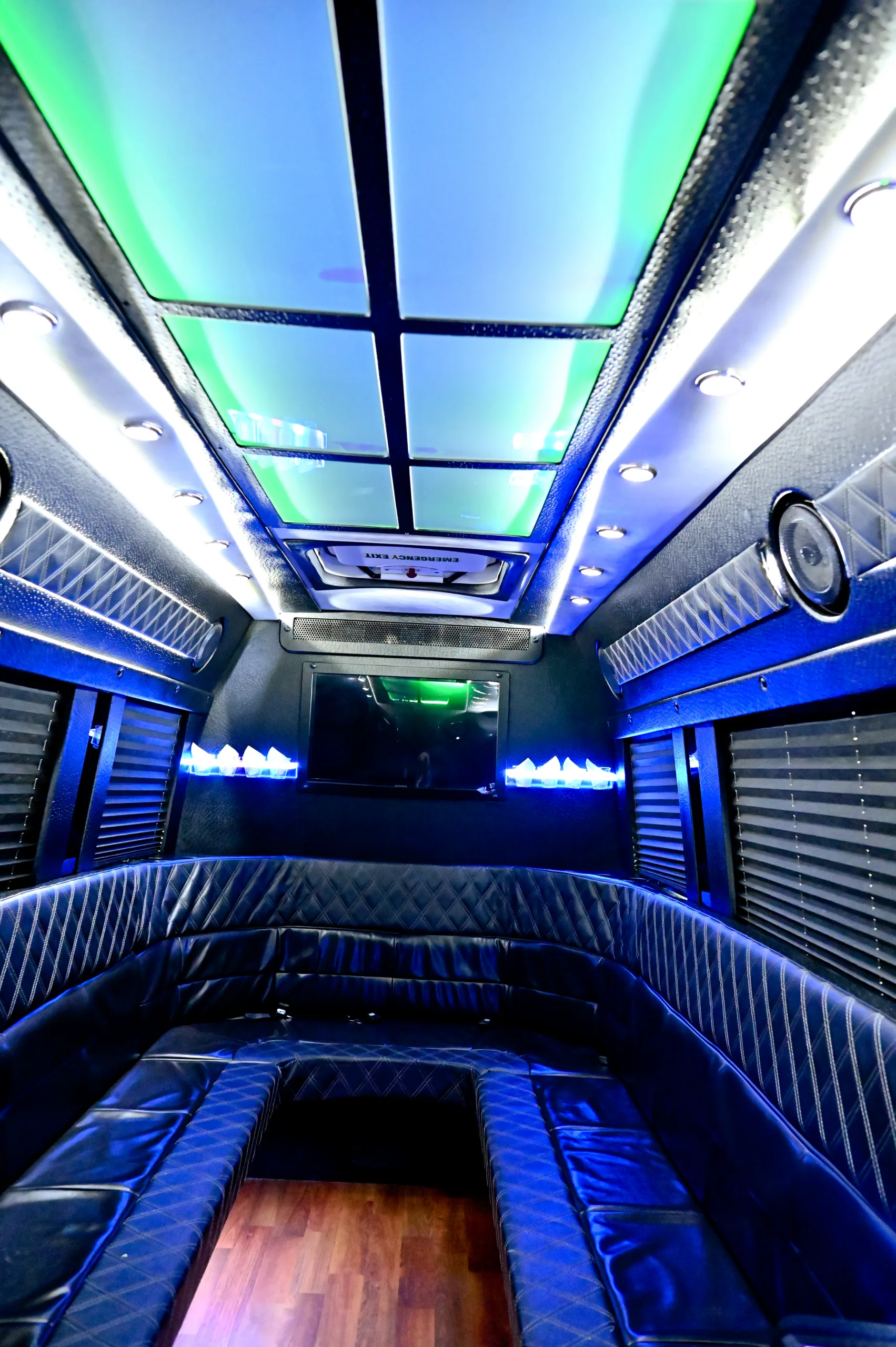 Executive-style sprinter van featuring premium leather seating, blue accent lighting, and cutting-edge entertainment technology.